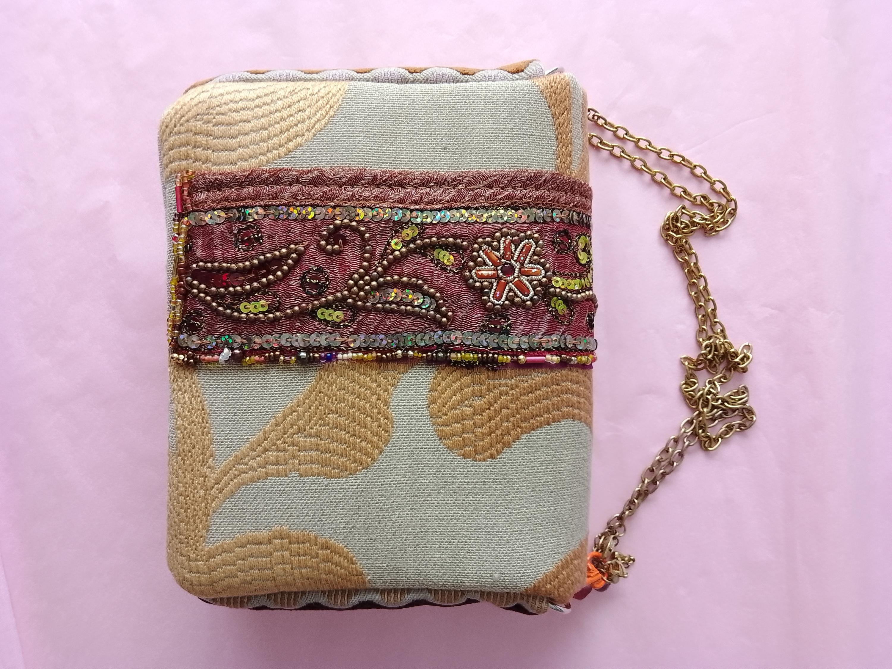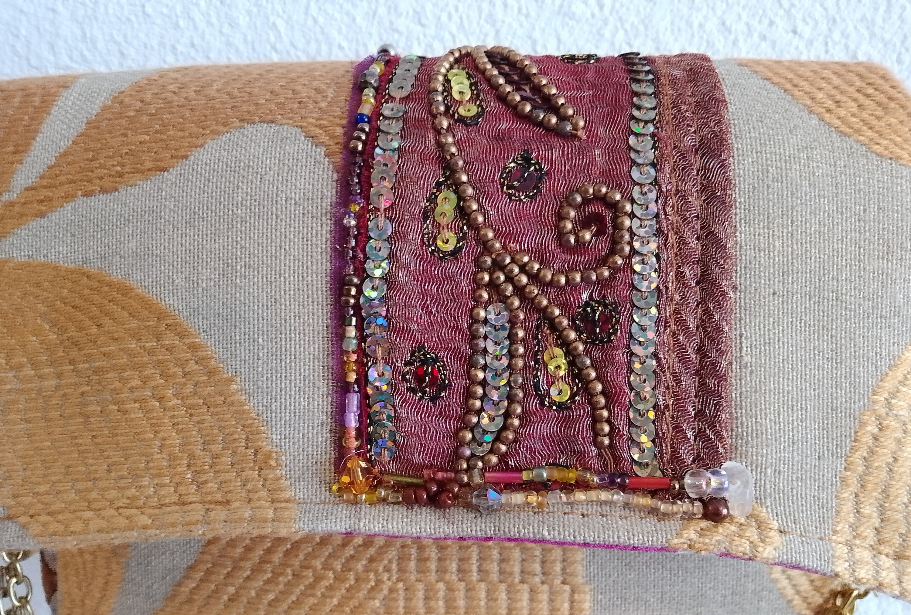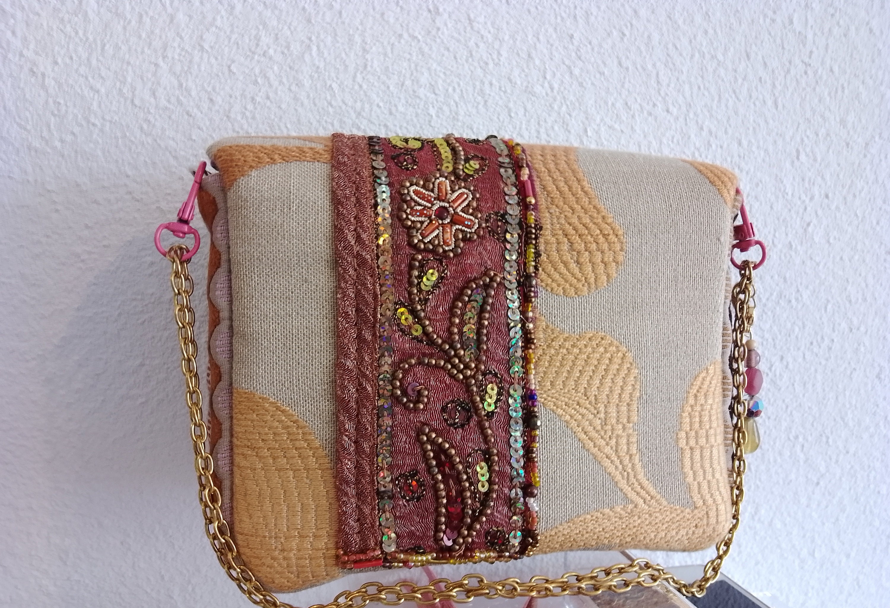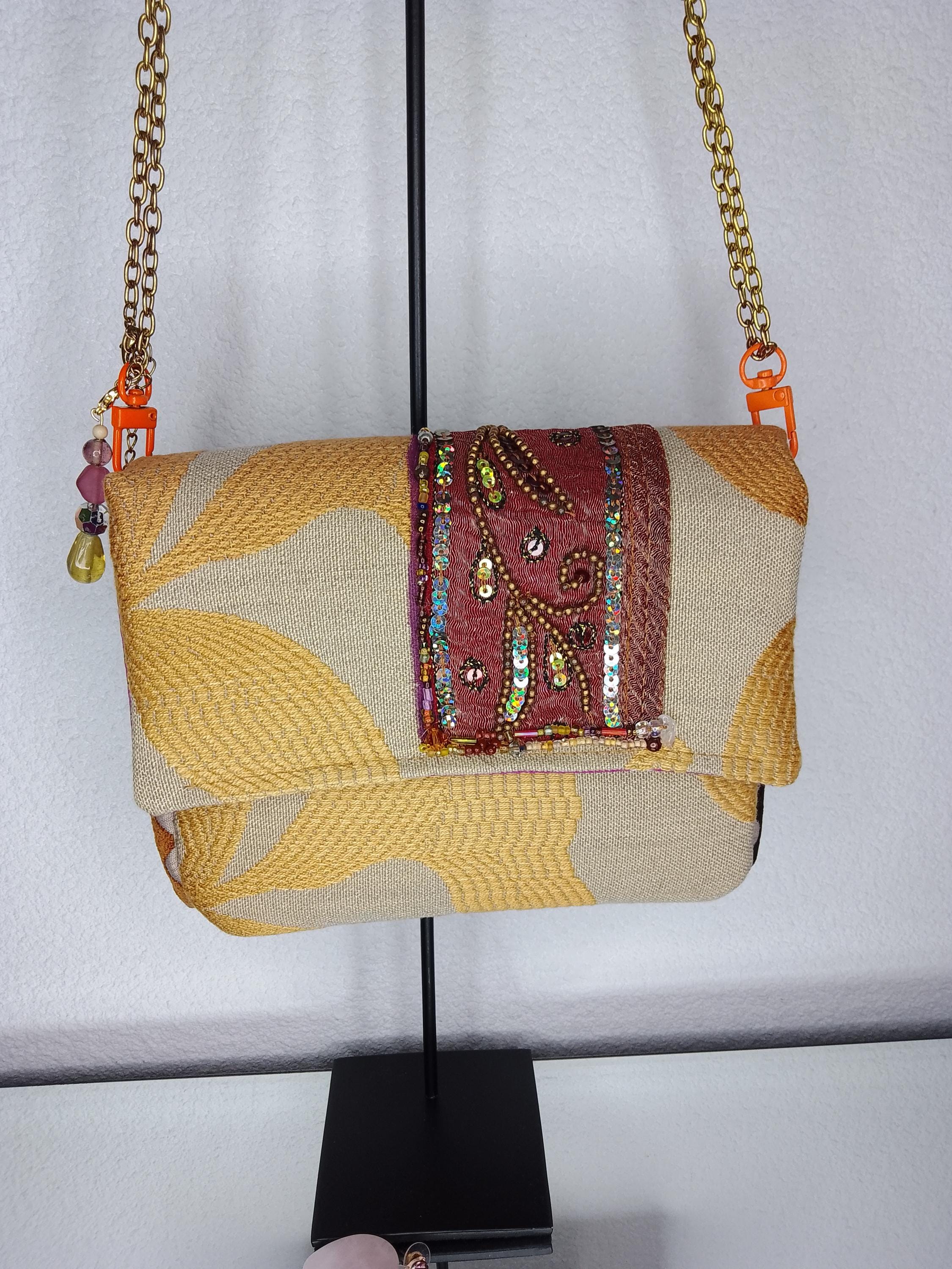 Mini handbag or shoulder bag in high-end designer textured beige and yellow upholstery fabric