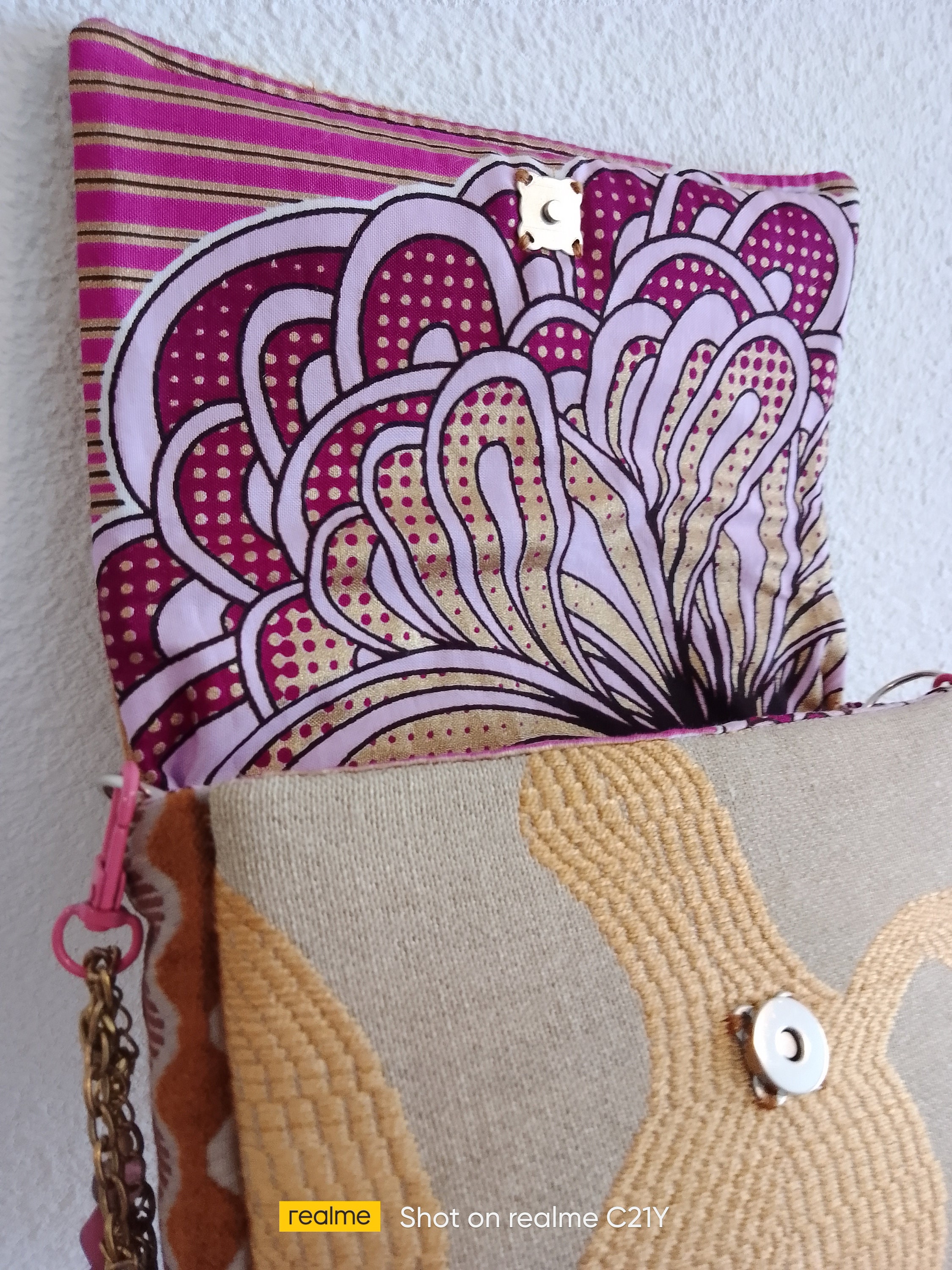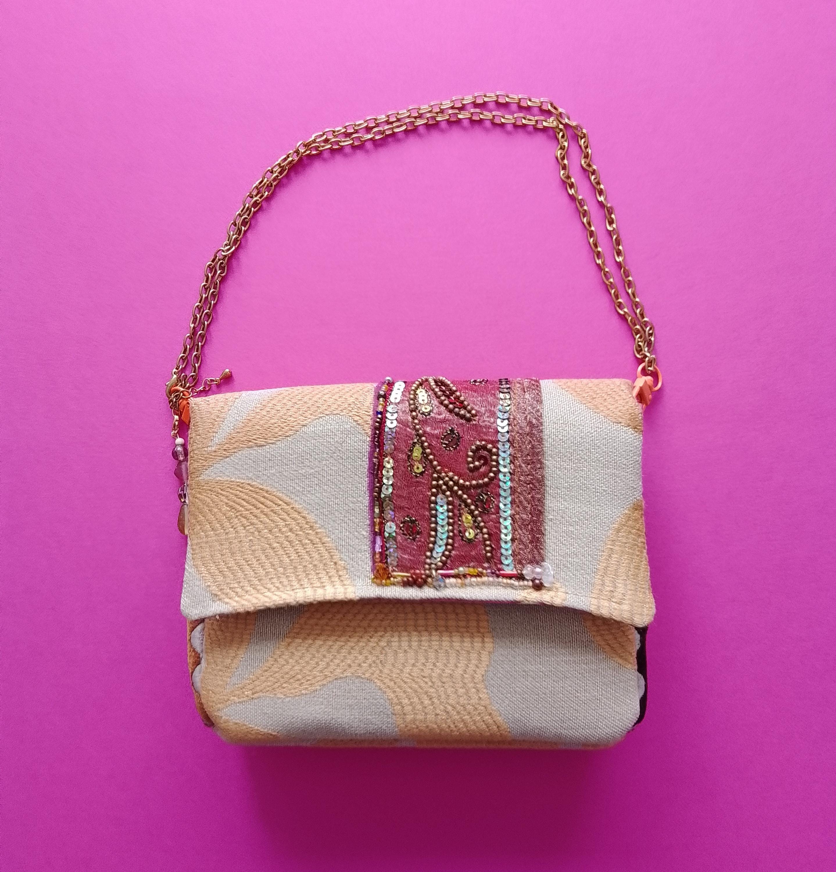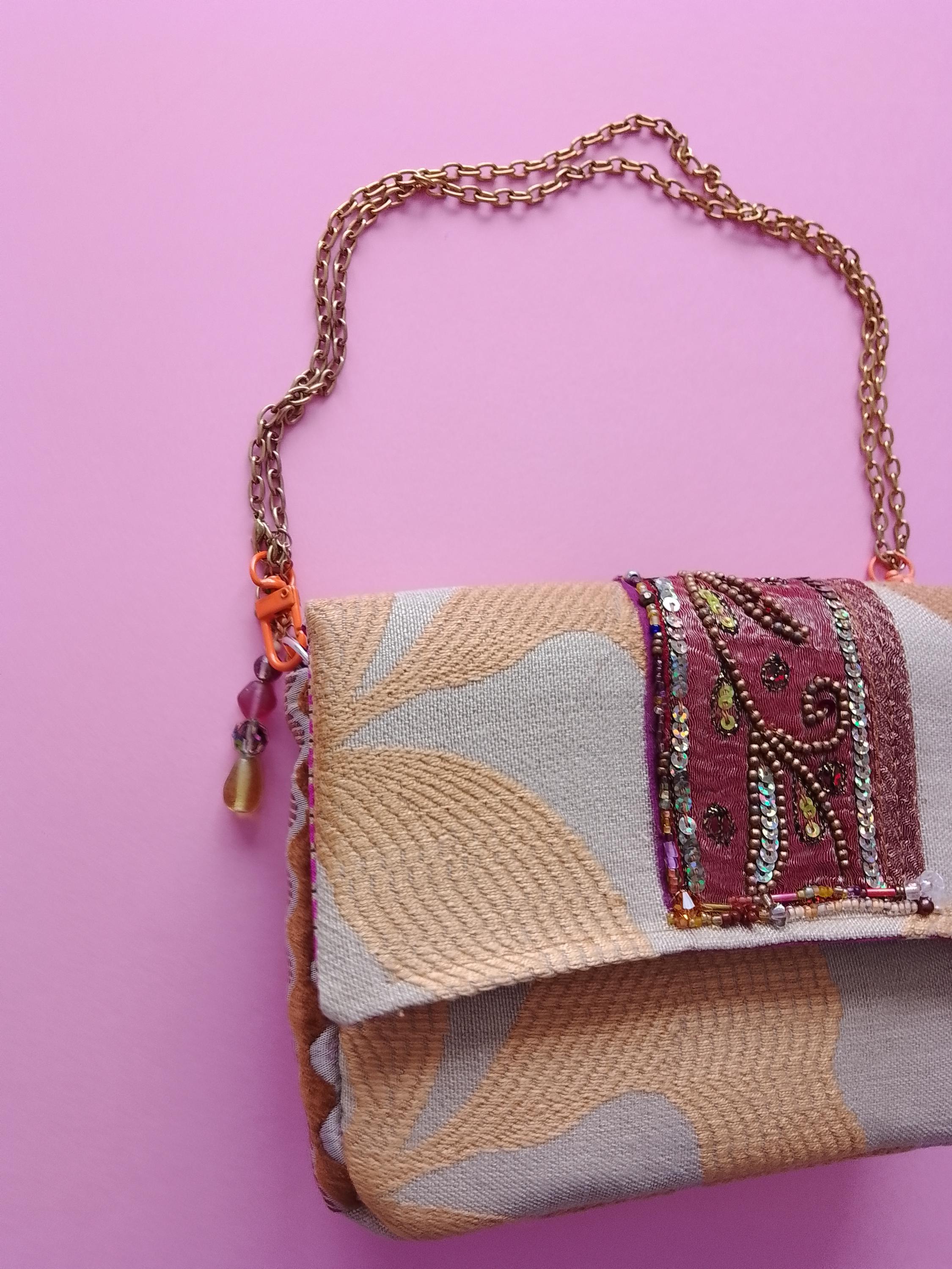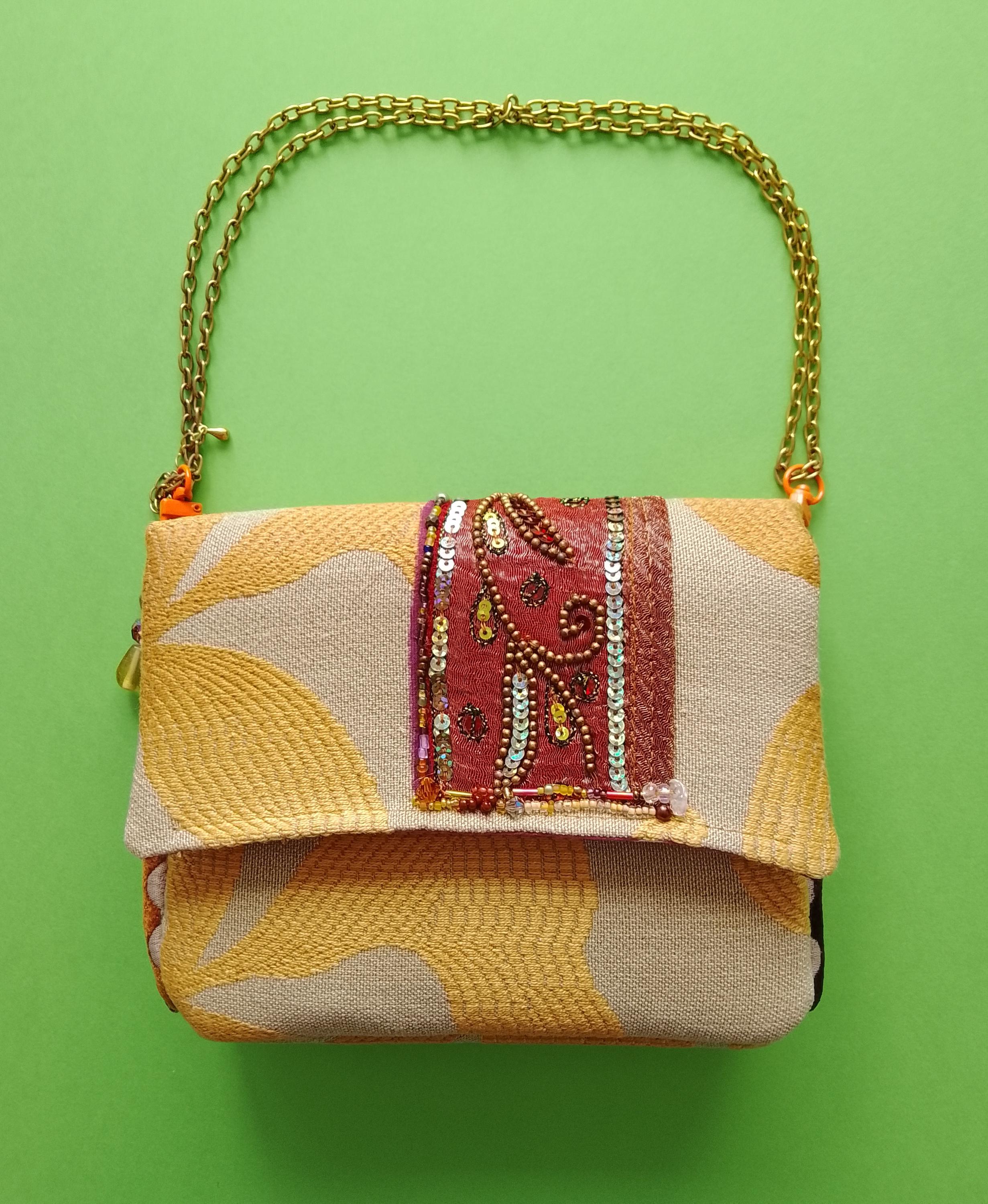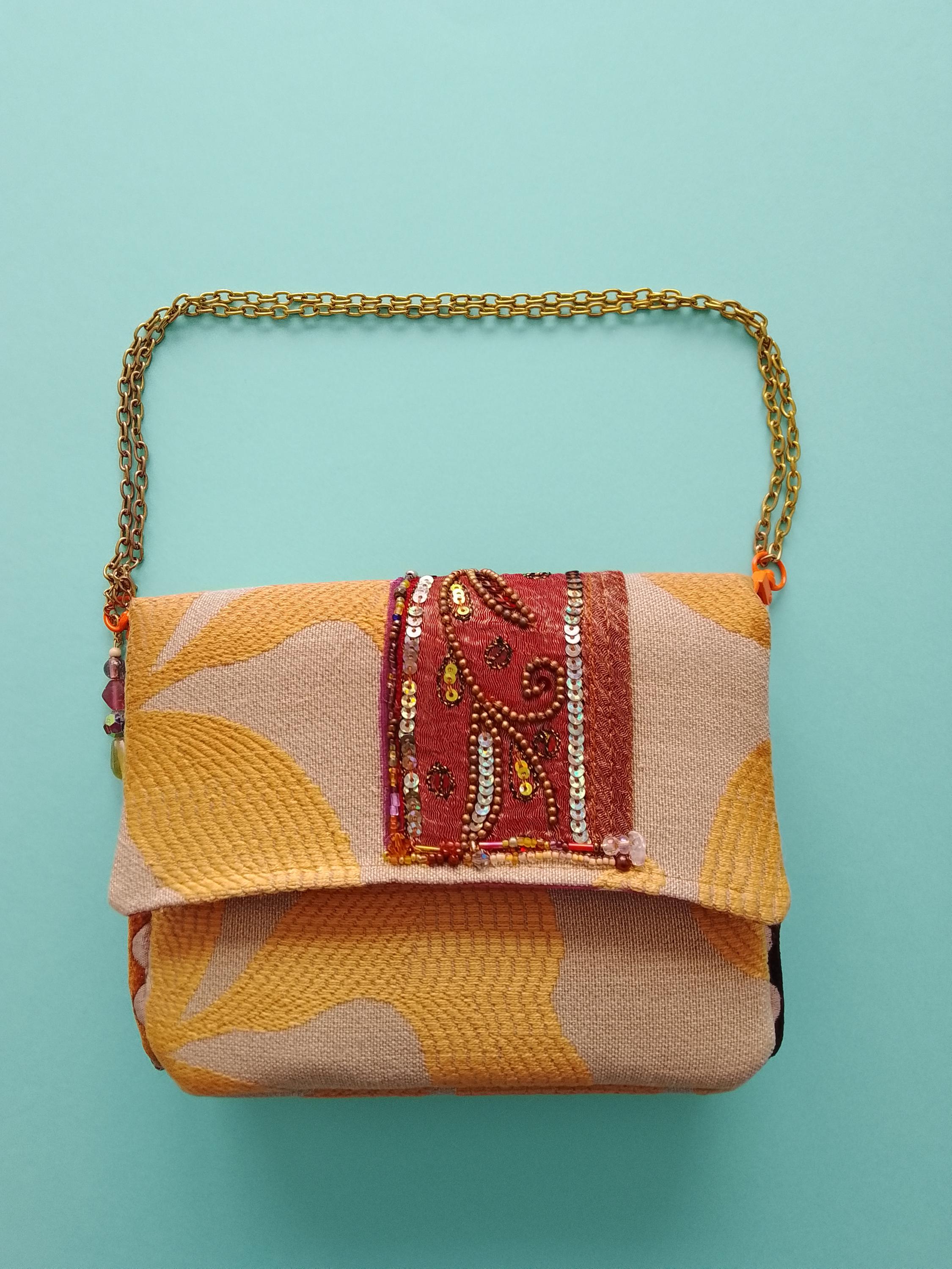 Mini handbag or shoulder bag in high-end designer textured beige and yellow upholstery fabric