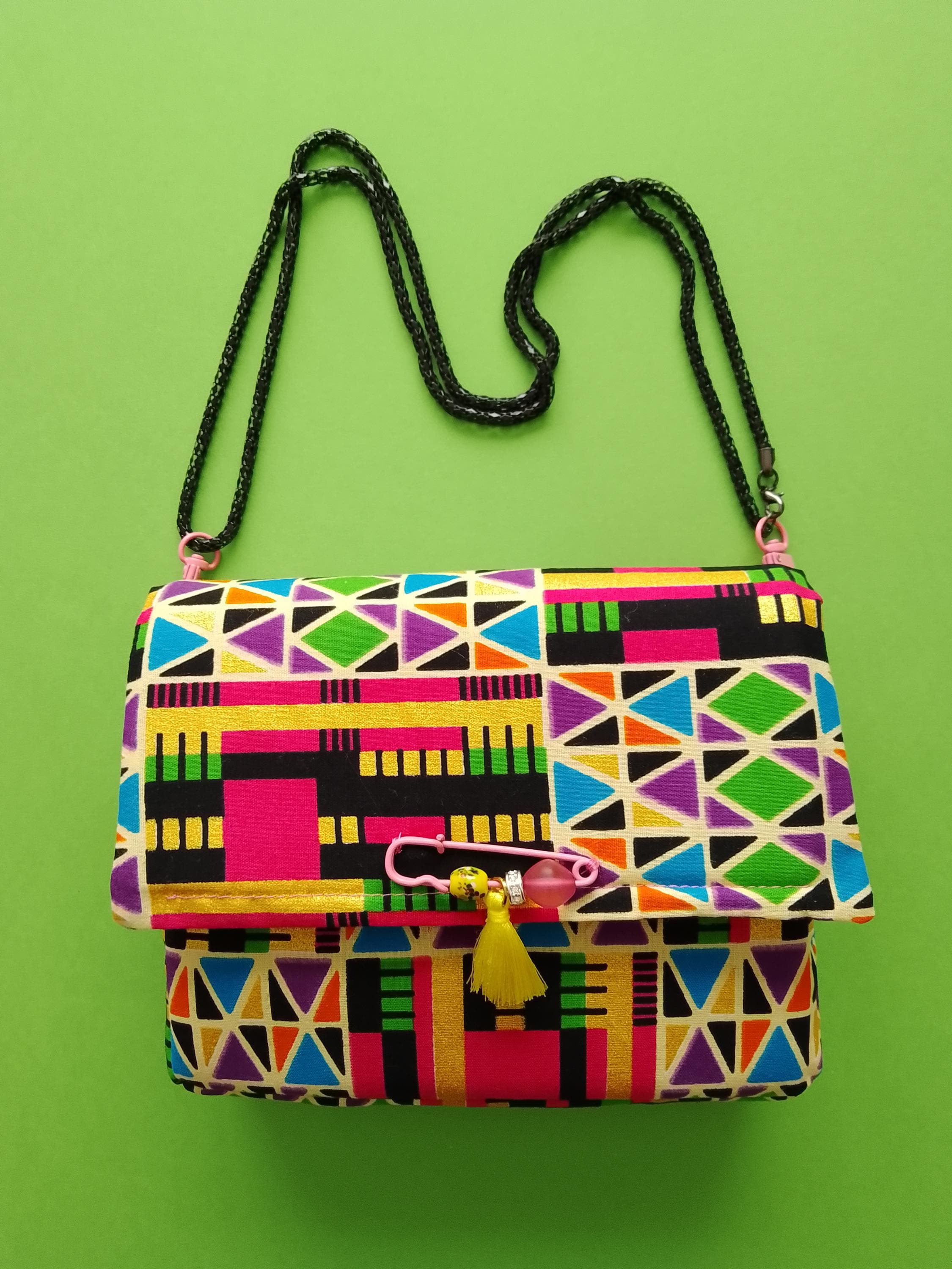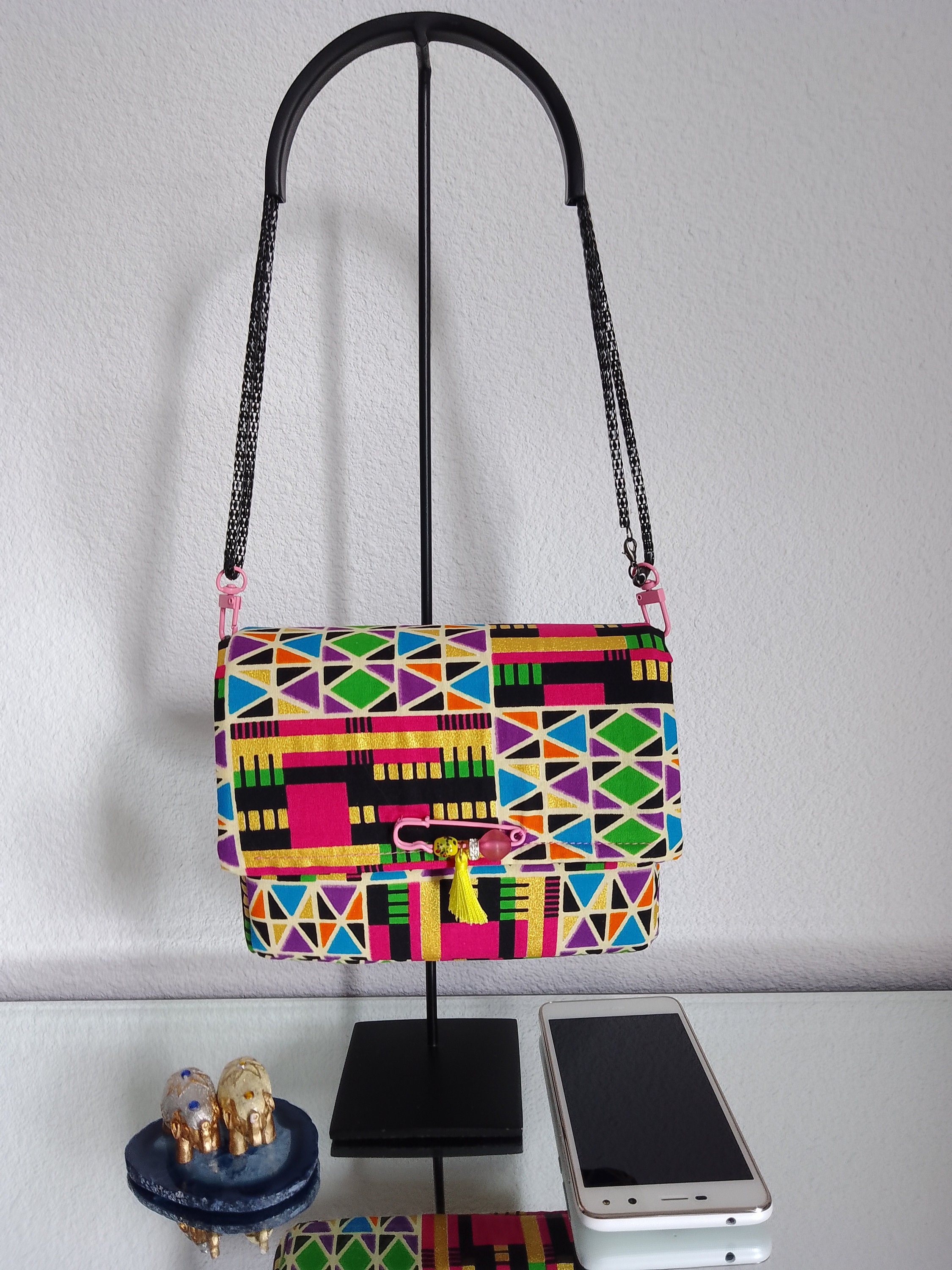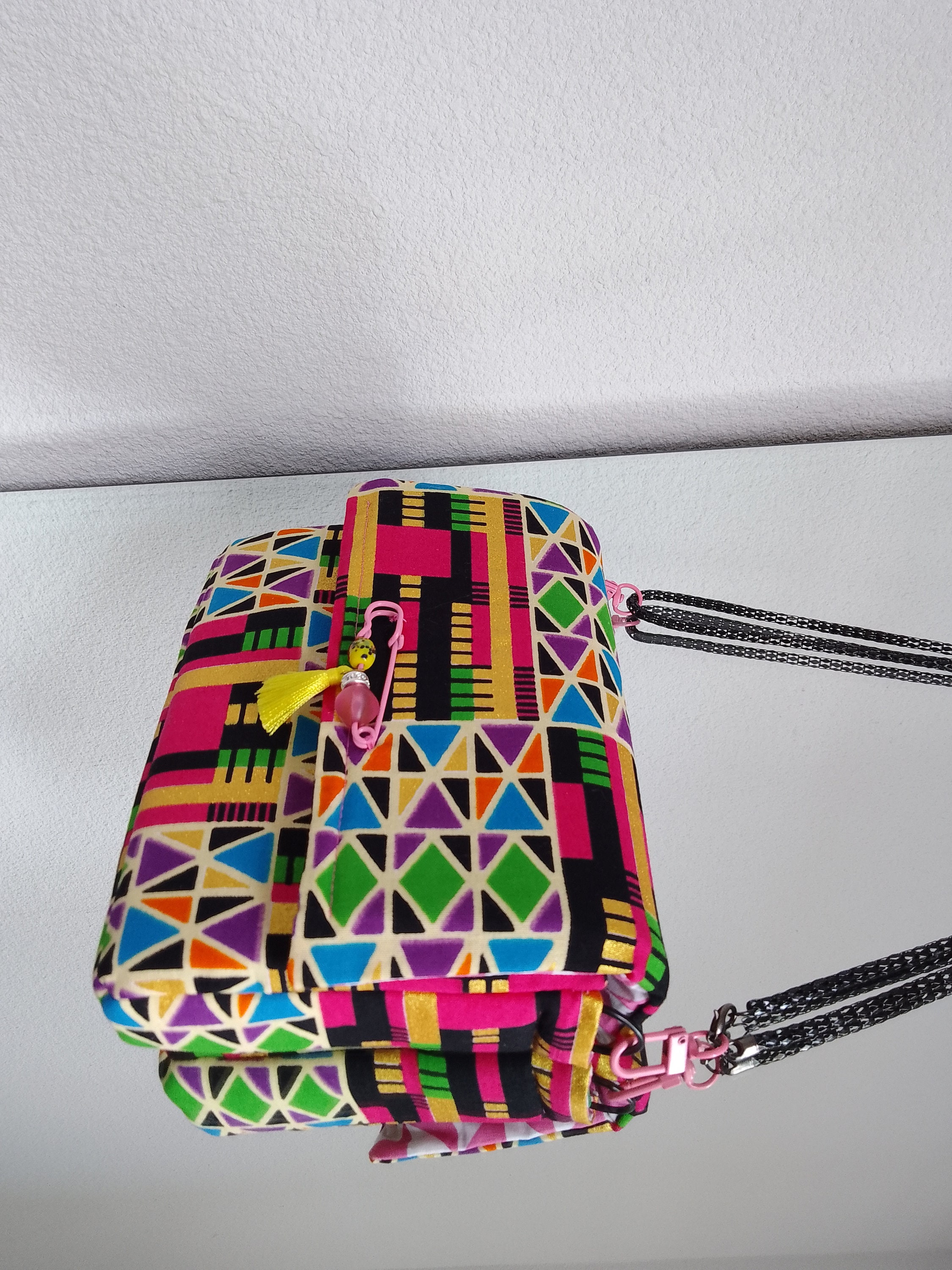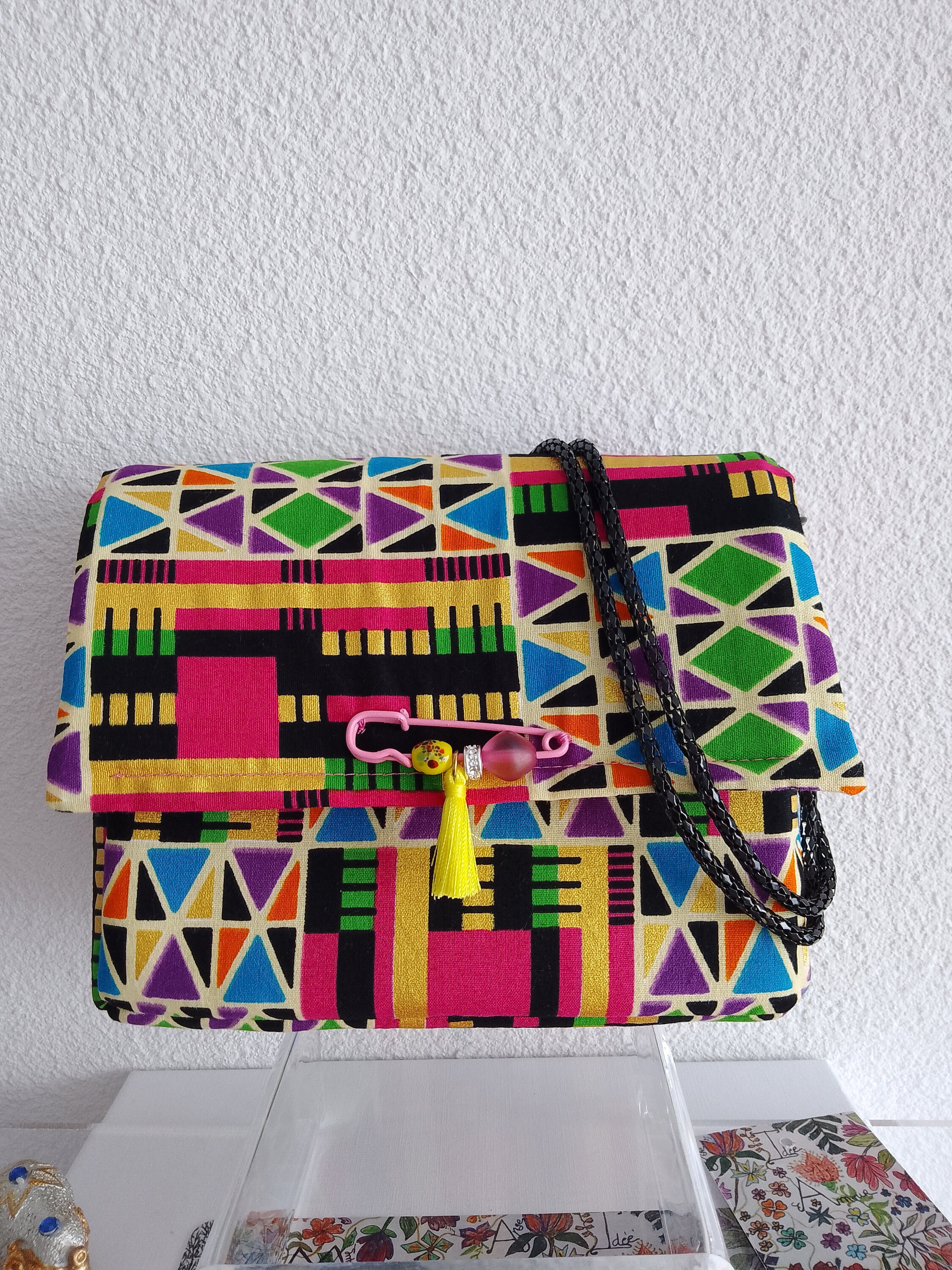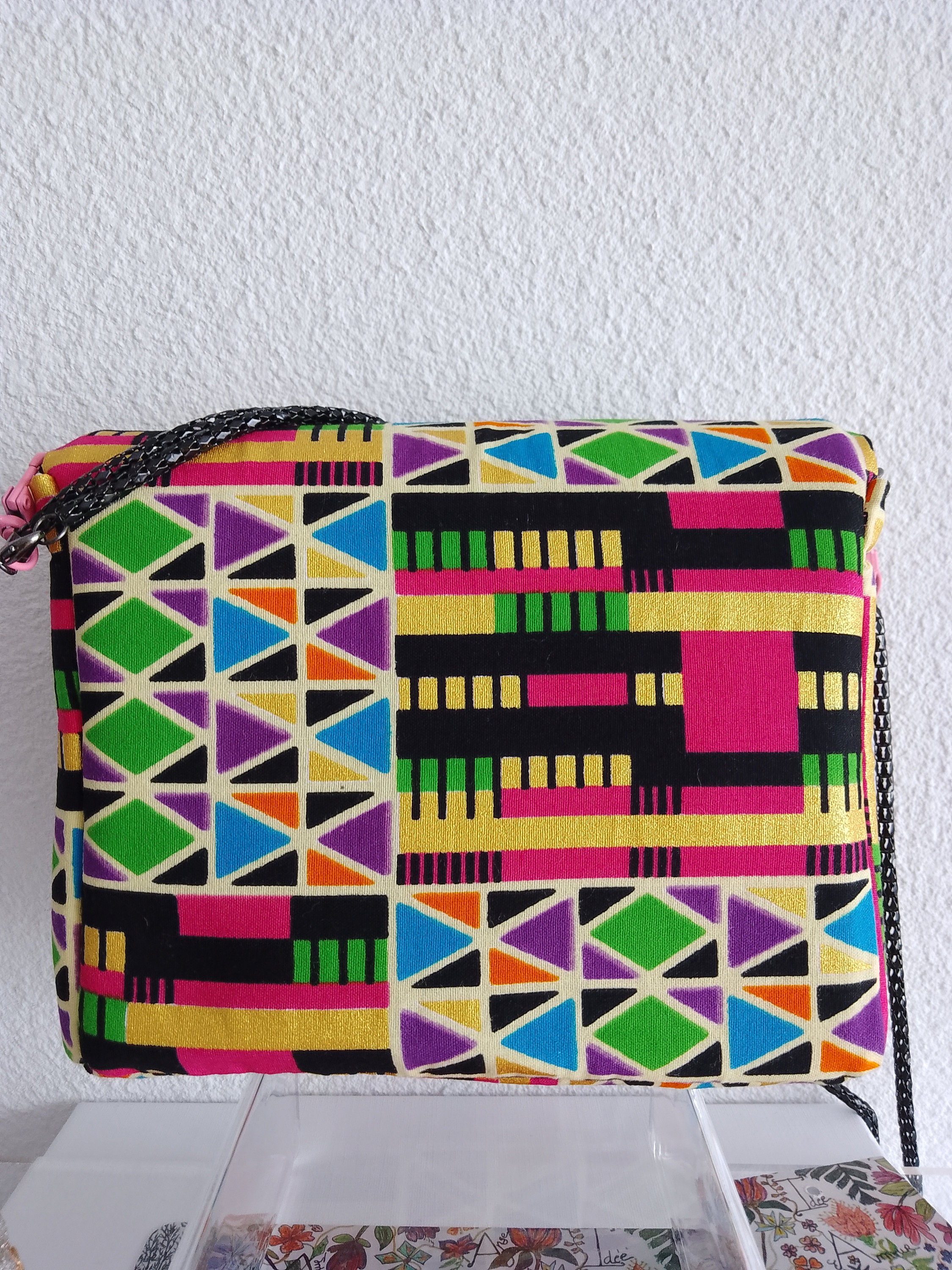 Mini handbag or shoulder bag in multicolored and gold wax fabric