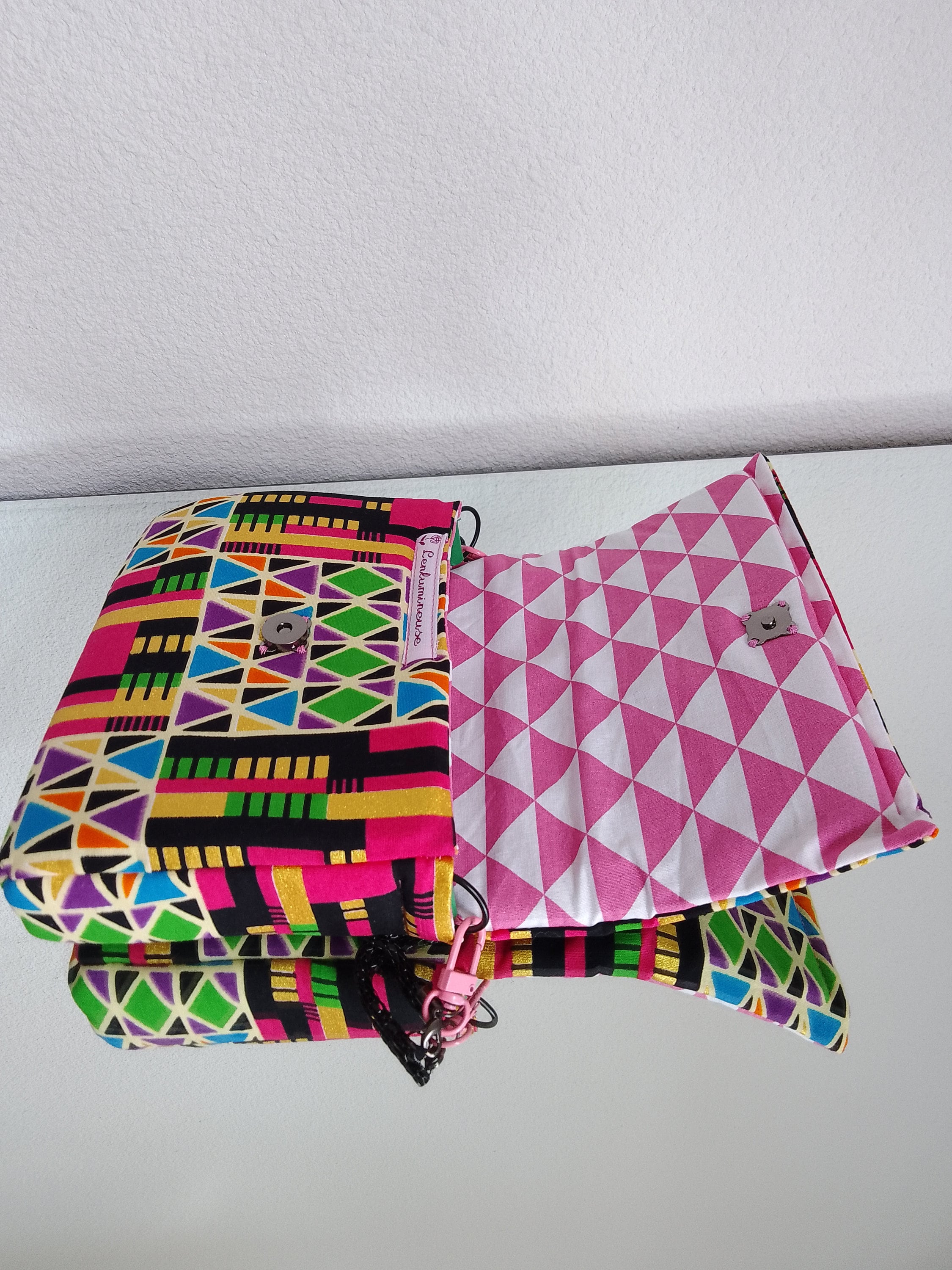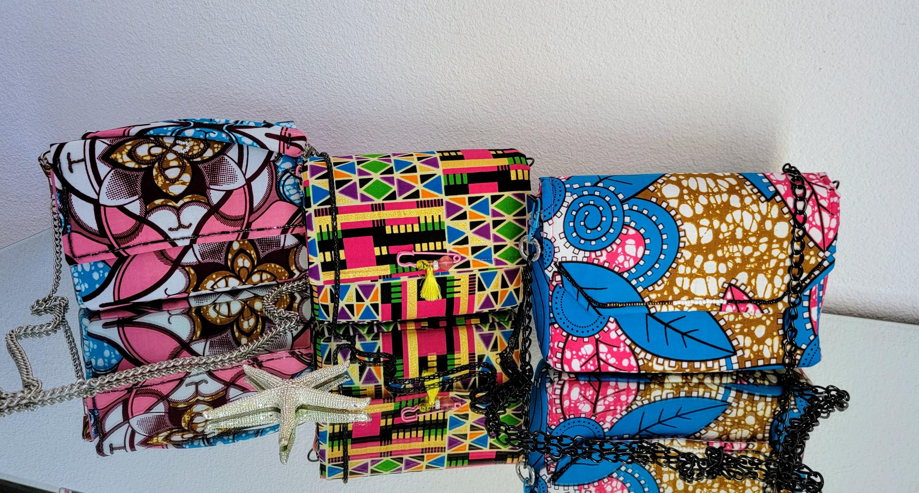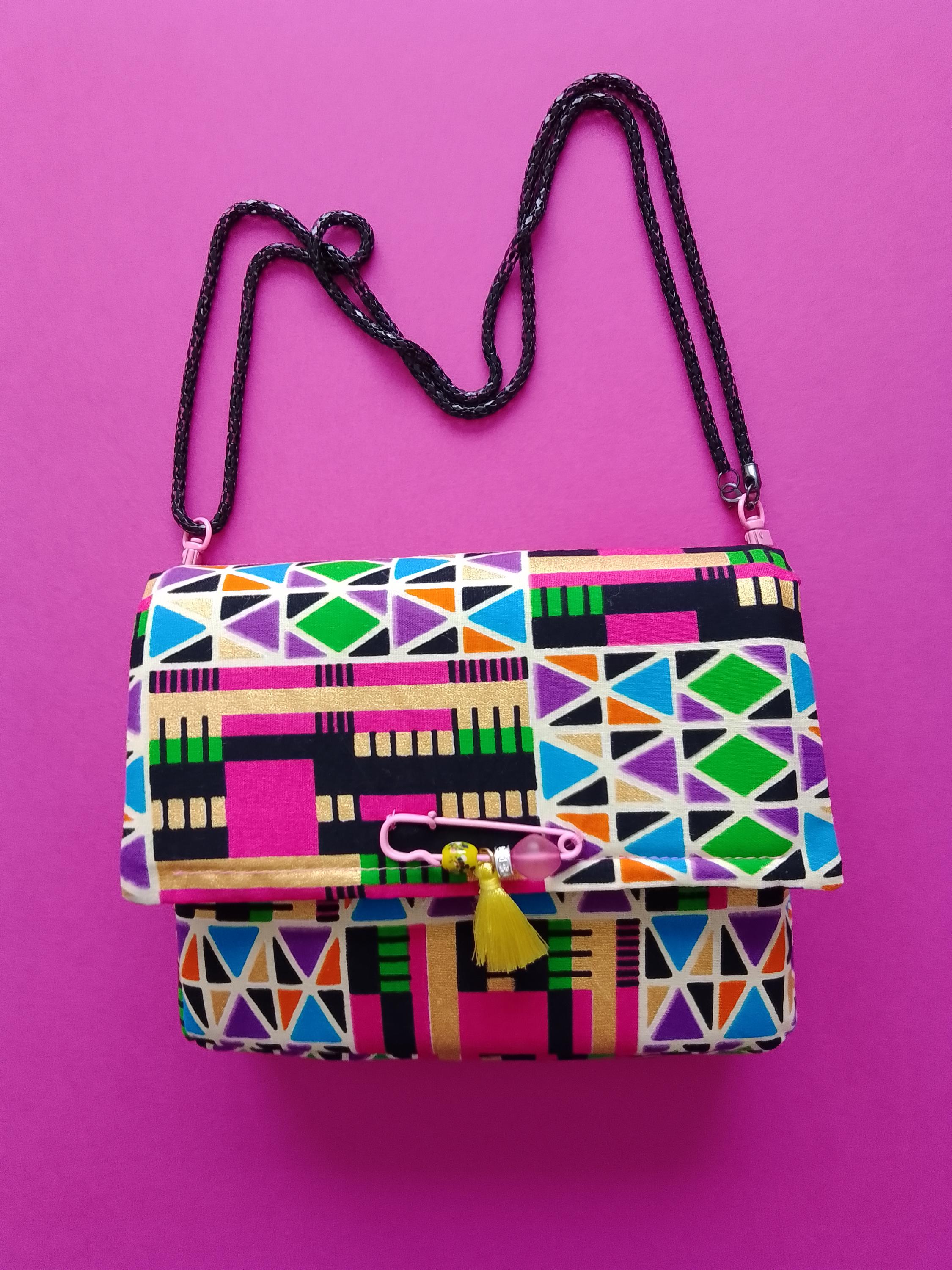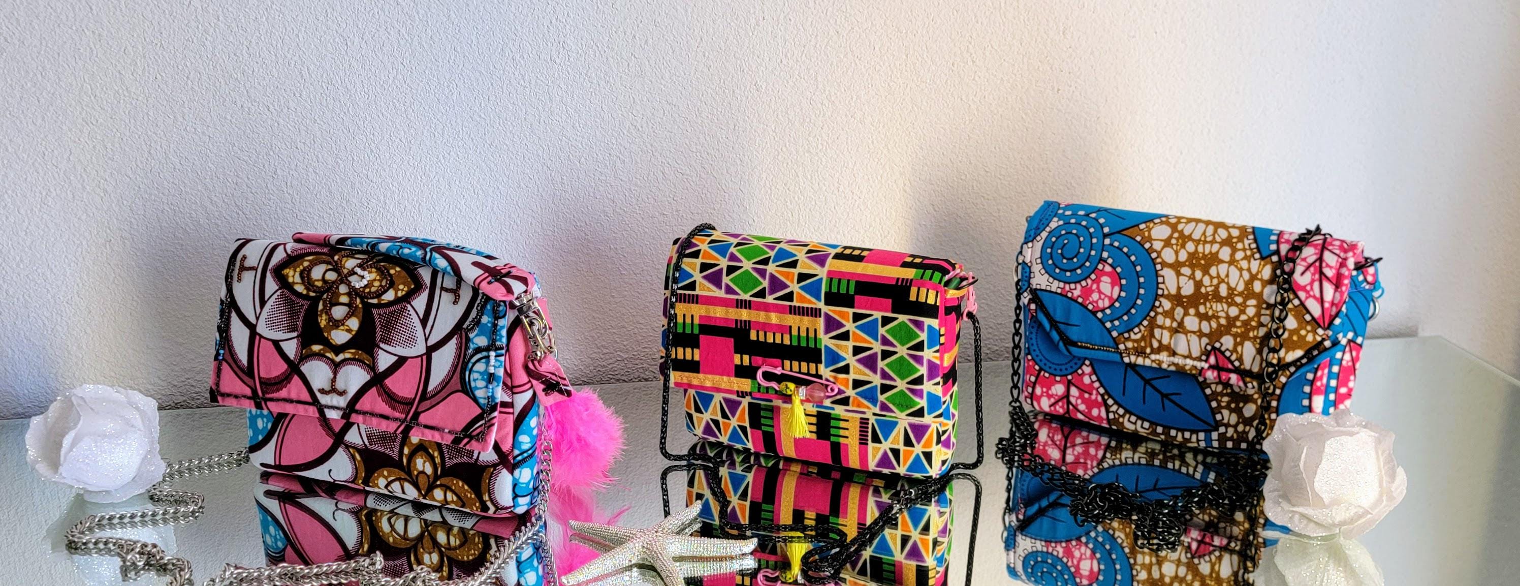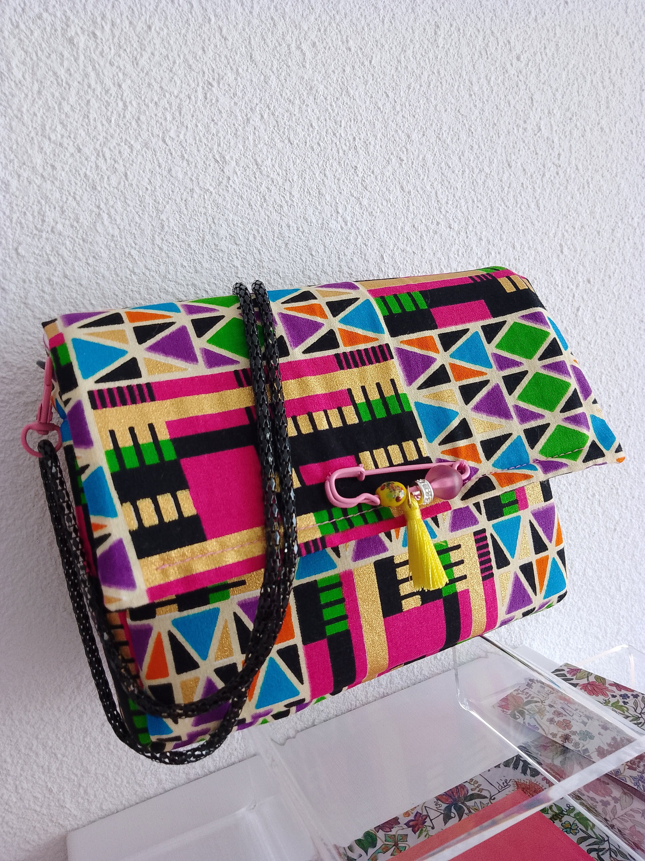 Mini handbag or shoulder bag in multicolored and gold wax fabric