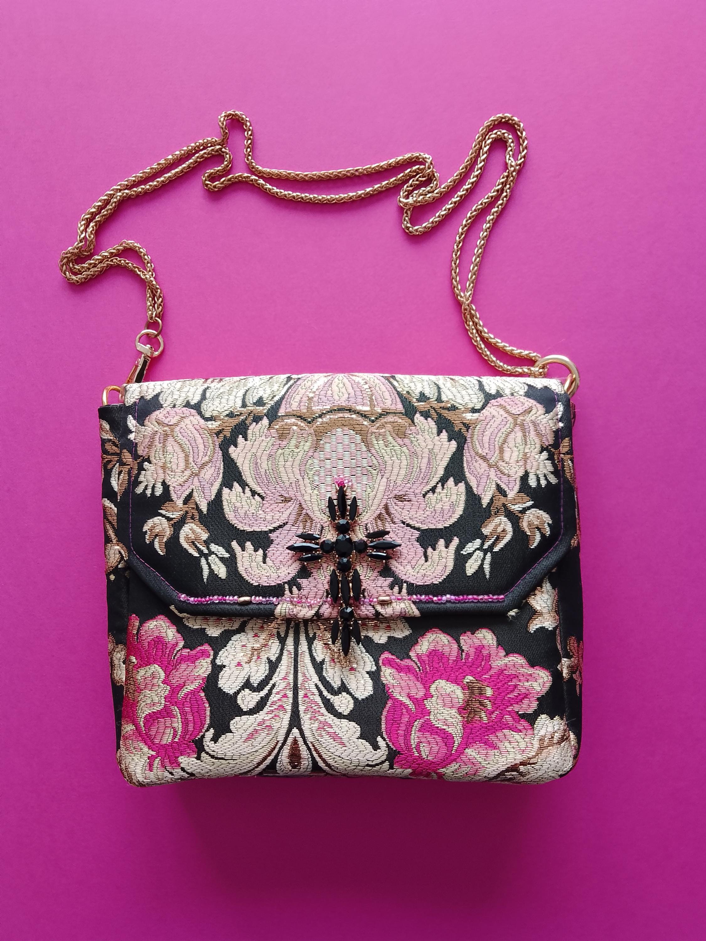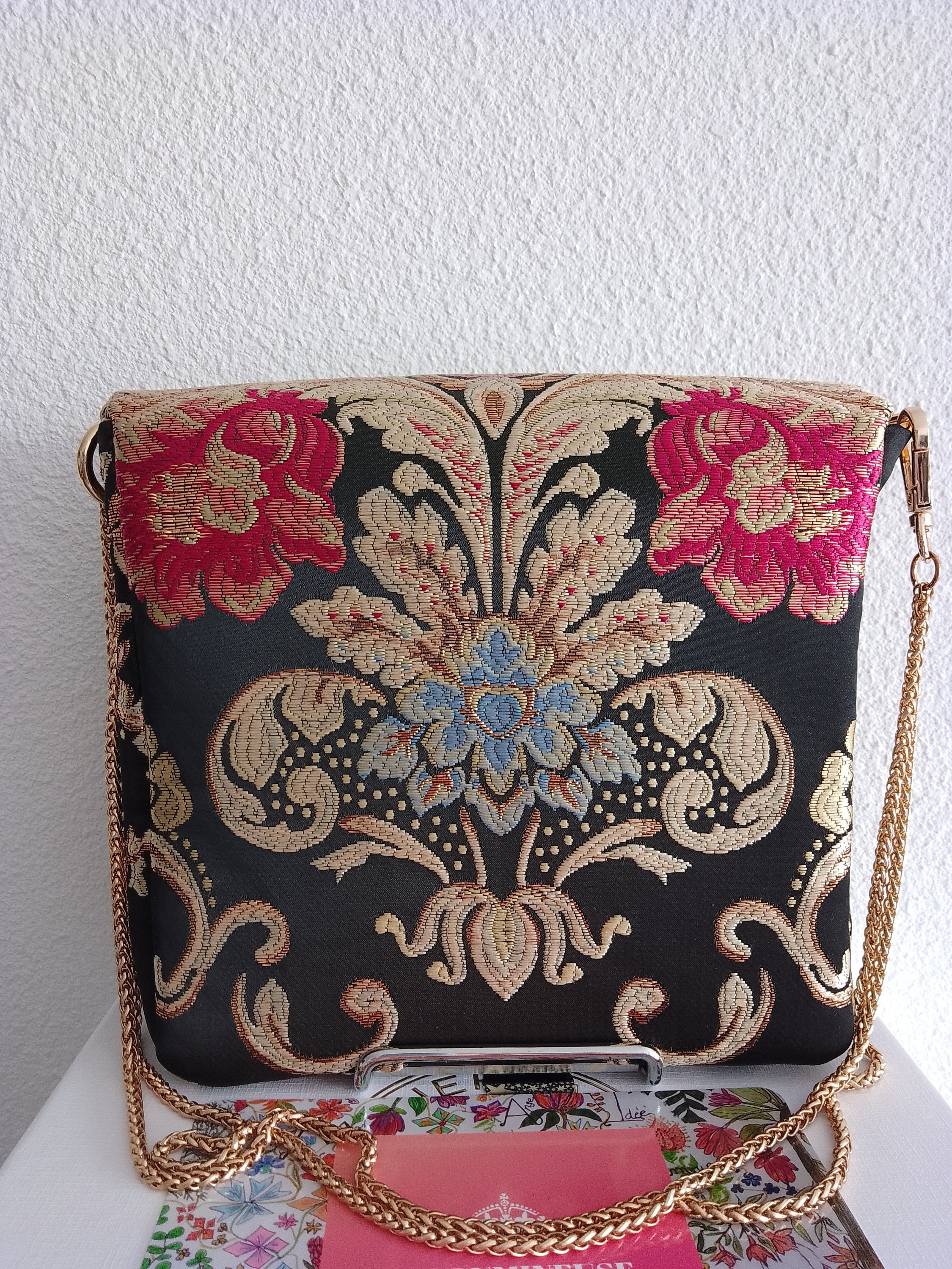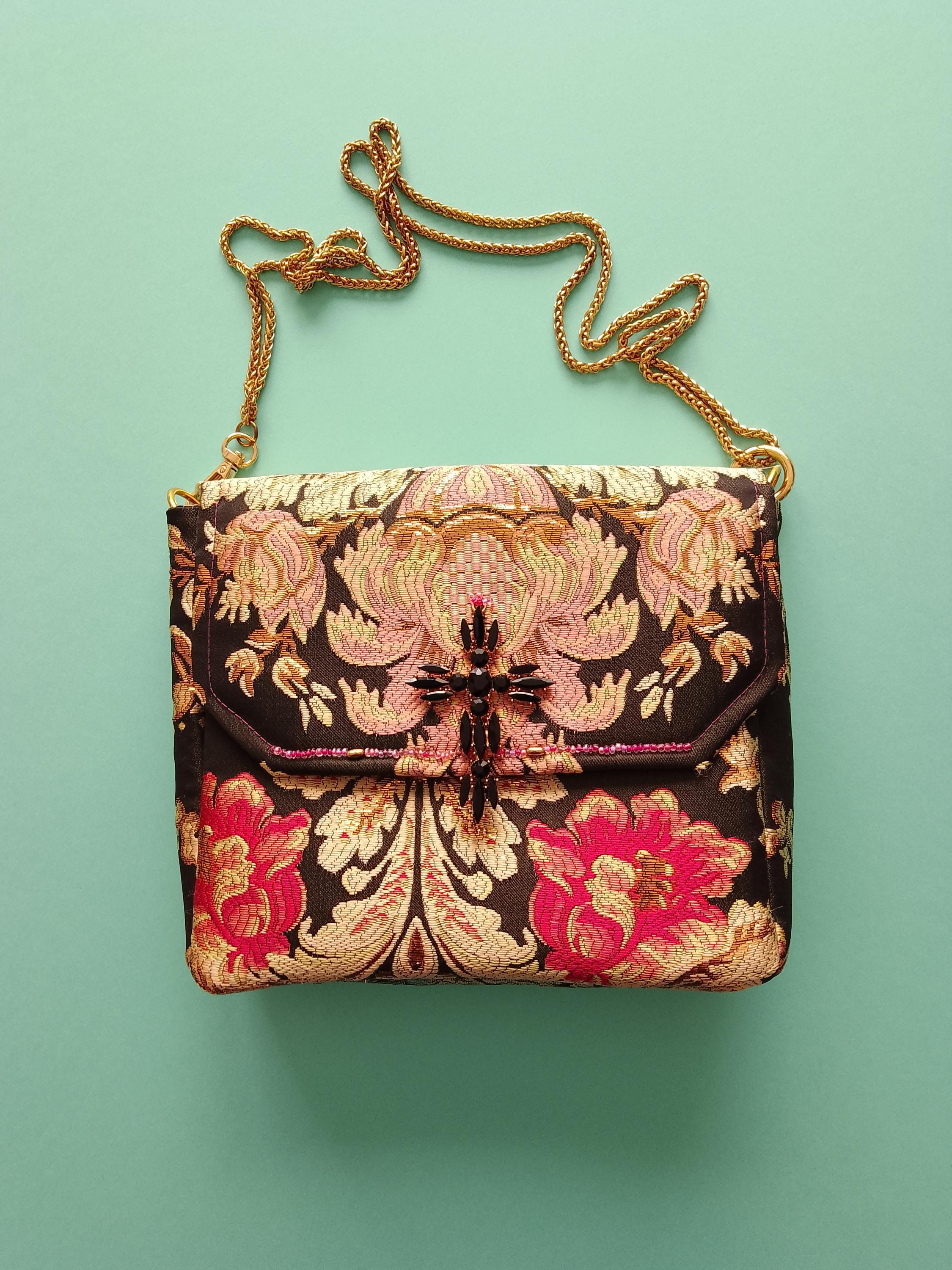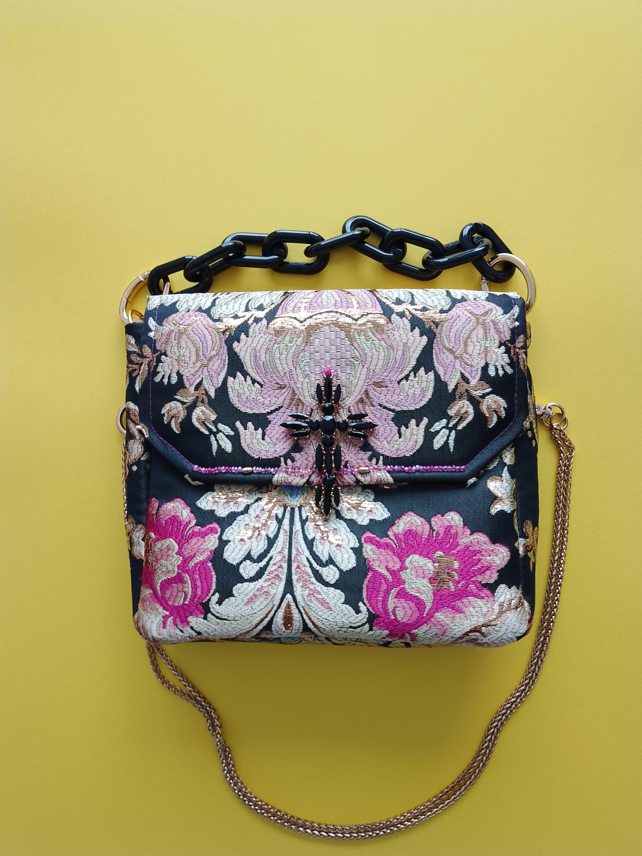 Evening handbag in precious brocade fabric with black, pink, gold and blue background