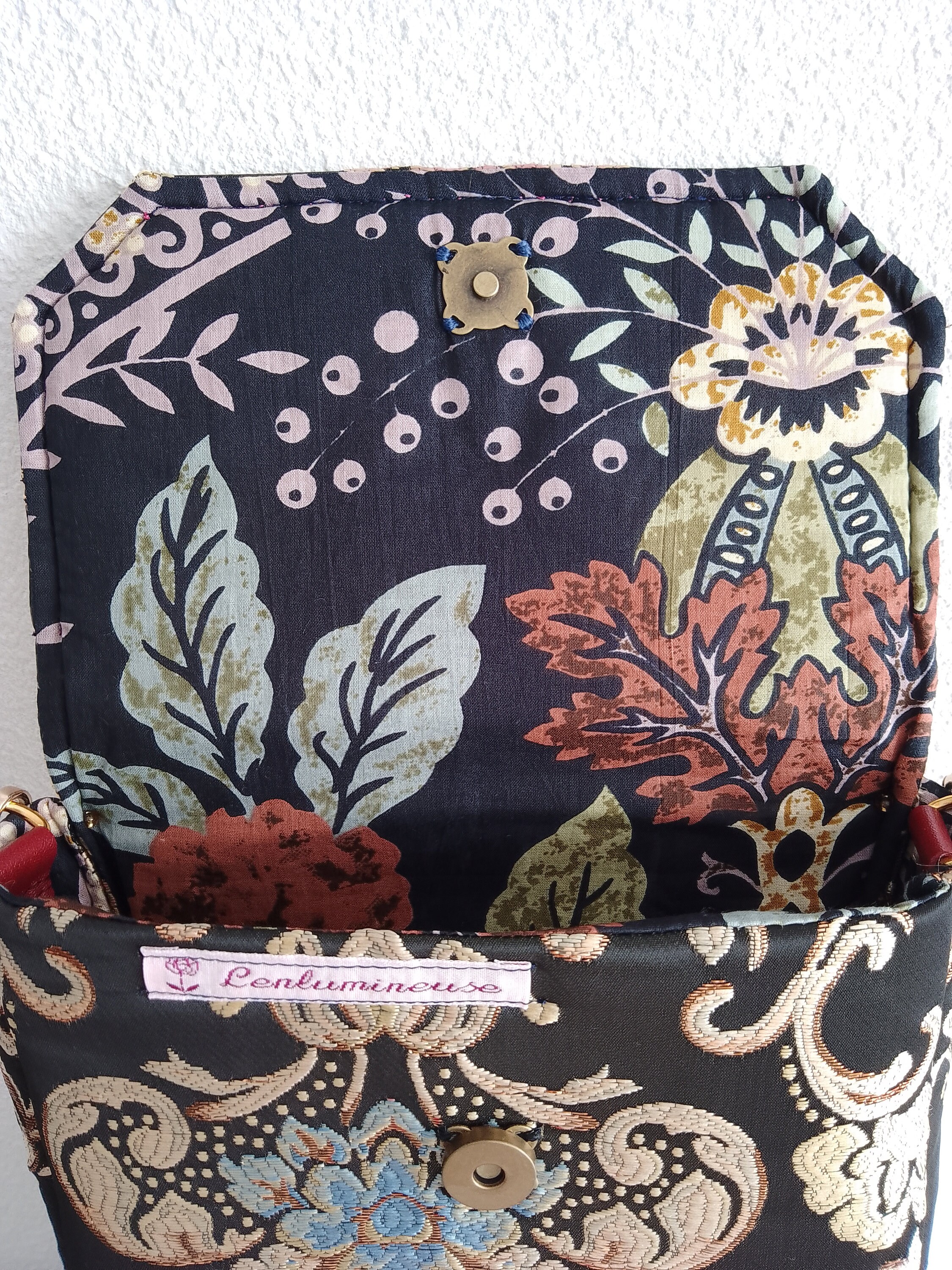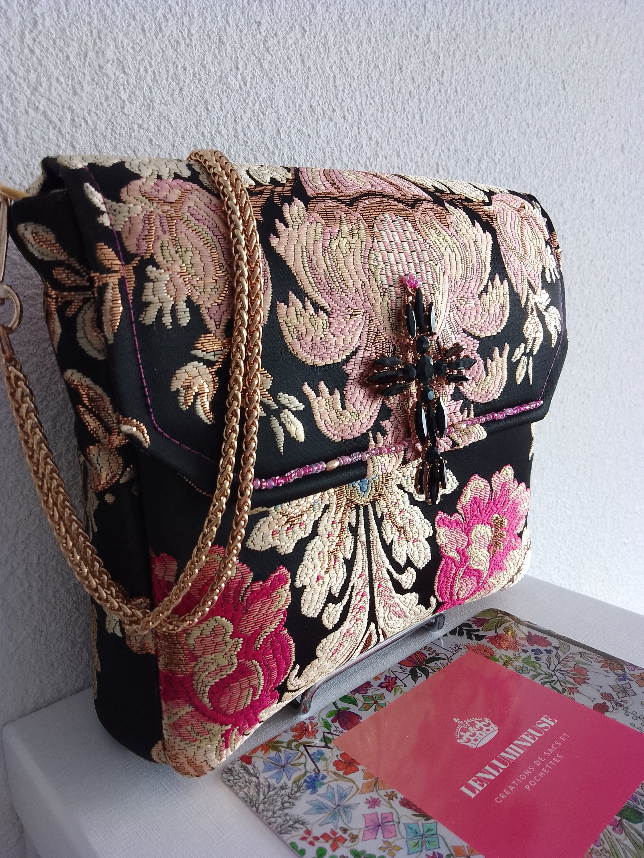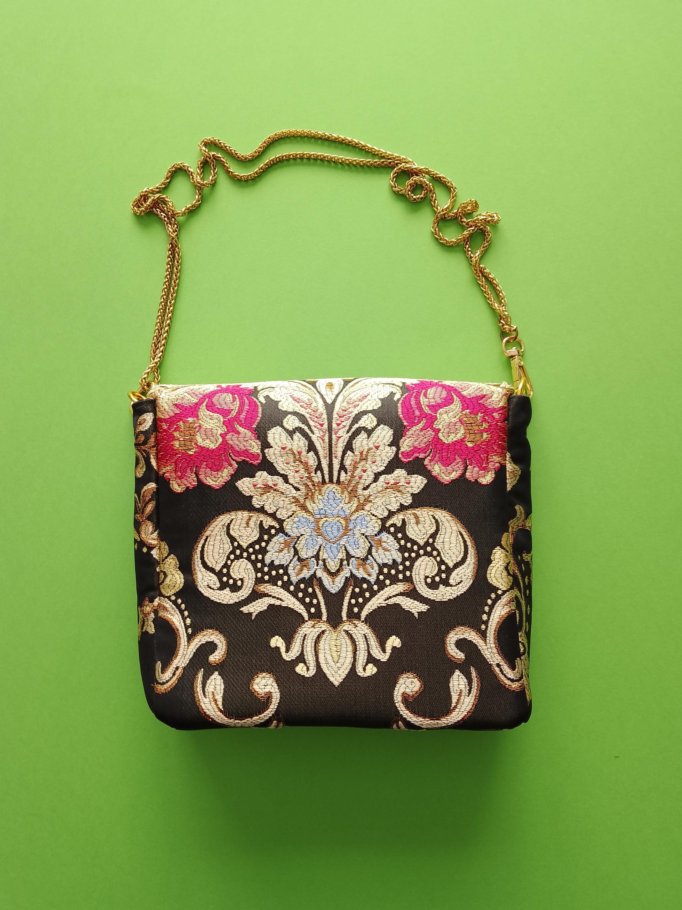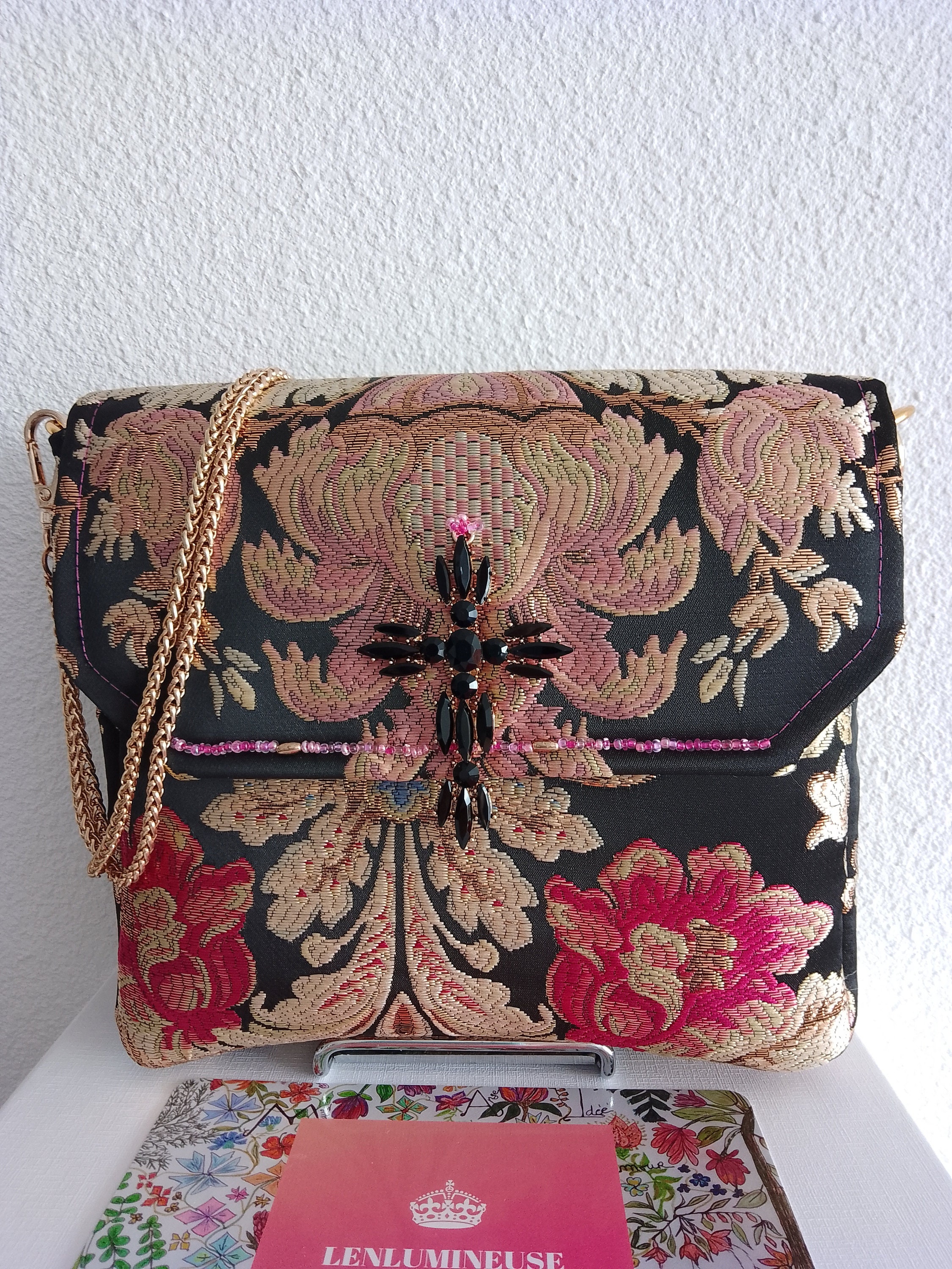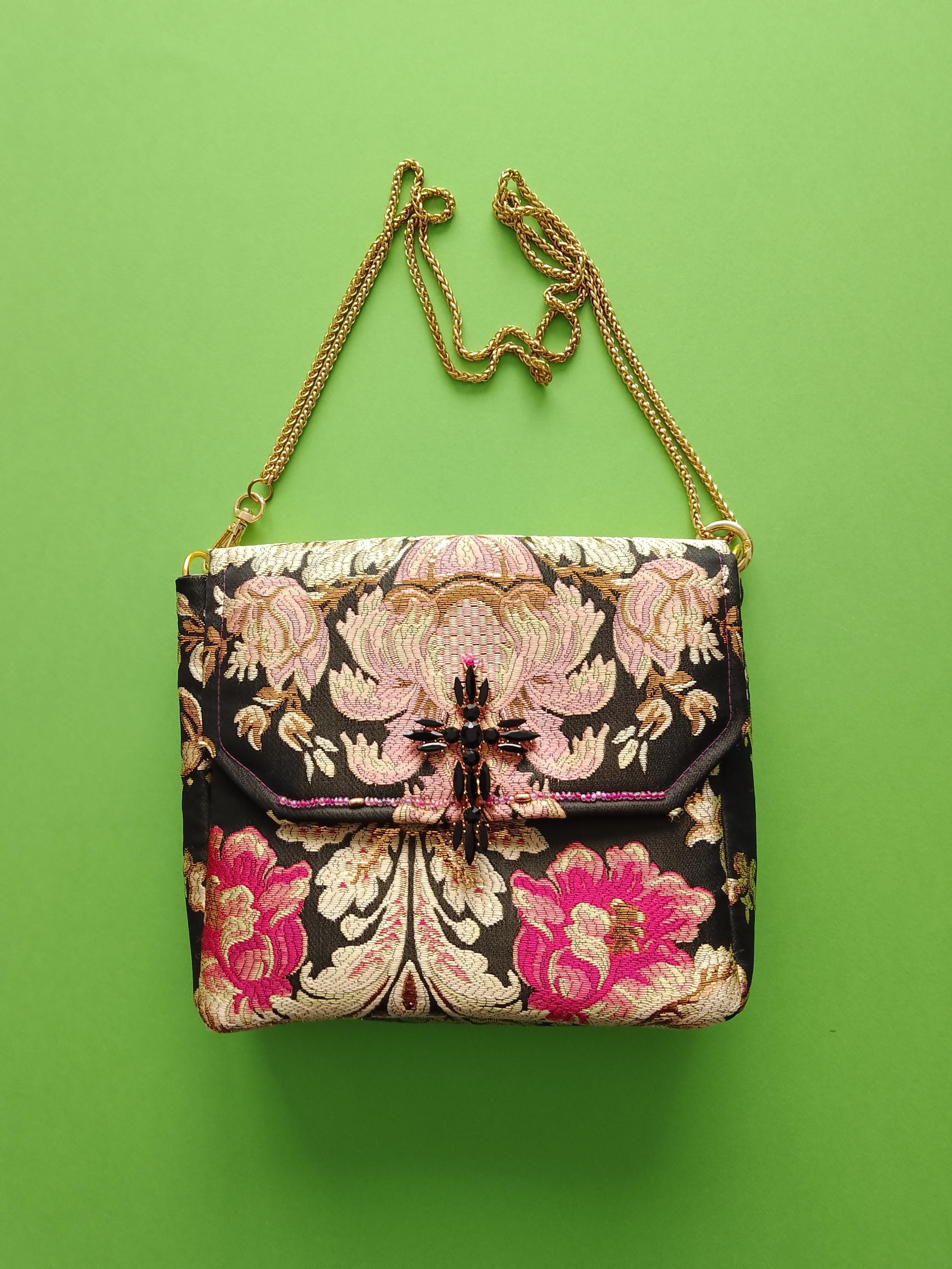 Evening handbag in precious brocade fabric with black, pink, gold and blue background